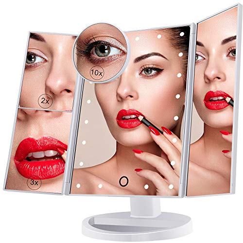 Espejo de Maquillaje Iluminado, 21 Luces LED Espejo Cosmético de Tocador, Pantalla Táctil de Aumento Tri-Fold 2X 3X 10X de Aumento, Rotación Libre de 180 °, Fuente de Alimentación Dual Blanco