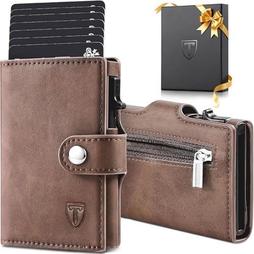TENBST Cartera Tarjetero con Bloqueo RFID, Automática Pop Up Cartera de Cuero, 8 Ranuras para Tarjetas, Tarjetero Hombre para Crédito, Billetes y Monedas con Caja de Regalo (Marrón)