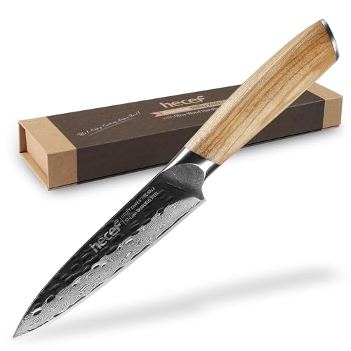 hecef Cuchillo Cocina Damaco 12.7 CM, Cuchillo Utilidad Profesional para cortar carne, jamonero, rutas y verduras – 67 Capas de Acero Damasco con Mango de Madera de Olivo