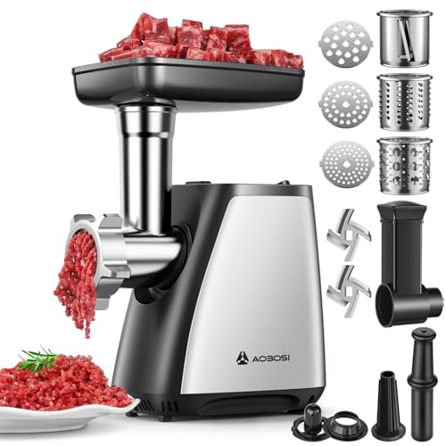 AAOBOSI Picadora de Carne, 4-En-1 Picadora de Carne Eléctrica [2800W Max] con 3 Cuchillas para Cortar, 2 Cuchillas para Desmenuzar, 4 Platos, Rellenador de Salchichas, Kit Kubbe, Acero Inoxidable