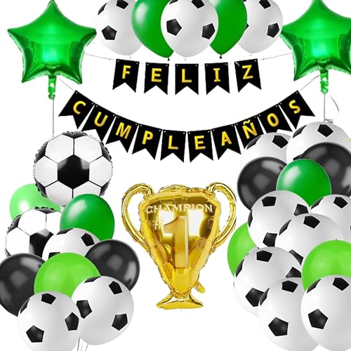 – ⚽ DECORACIÓN COMPLETA PARA CUMPLEAÑOS DE FÚTBOL: Incluye guirnalda de «Feliz Cumpleaños», globos temáticos de fútbol y adornos perfectos para una fiesta inolvidable.