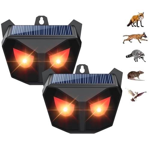 – Conducir eficazmente a los animales lejanos: los dispositivos disuasorios para animales están diseñados con fuertes luces rojas intermitentes, que estimulan la llama roja o los ojos de los depredadores aterradores para engañar y ahuyentar a la mayoría de los invasores lejos de su área, para proteger su jardín, patio, granja, campos de verduras, cubos de basura, aves, gatos, perros, mascotas, pollos y conejos de los ataques.