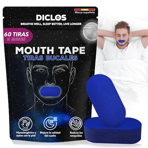 DICLOS 60 Tiras Bucales para Dormir. Mouth Tape for Sleeping. Cinta Bucal Ronquidos. Mouth strips. Parches Boca. Tiras Boca para Dormir con la Boca Cerrada. Myotape. Tapa Bocas. (Azul Sin Orificio)